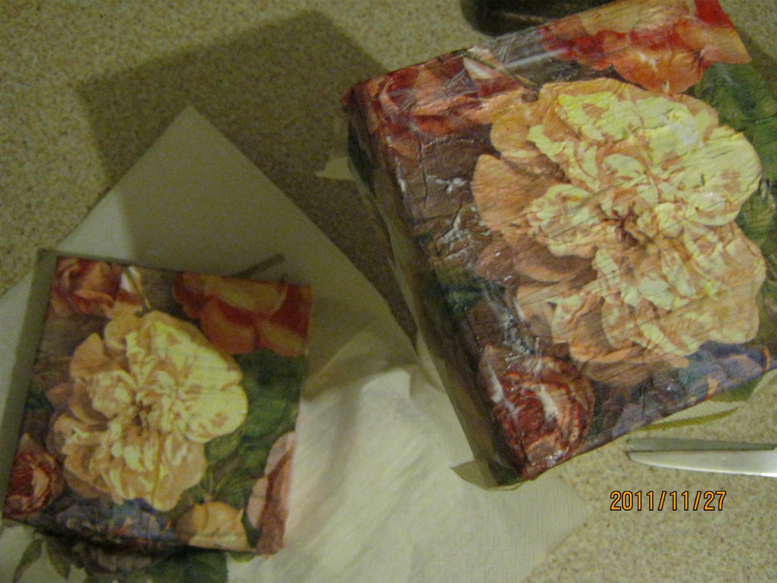 Kutuyu önce beyaza boyadım sonra da tutkalla yapıştırdım.. bu peçete kaplama olayı insanın oturduğu yerde olacak birşey değil hani örgü ve dikiş gibi değil gazete kağıdıd sermeden yapılmıyor
